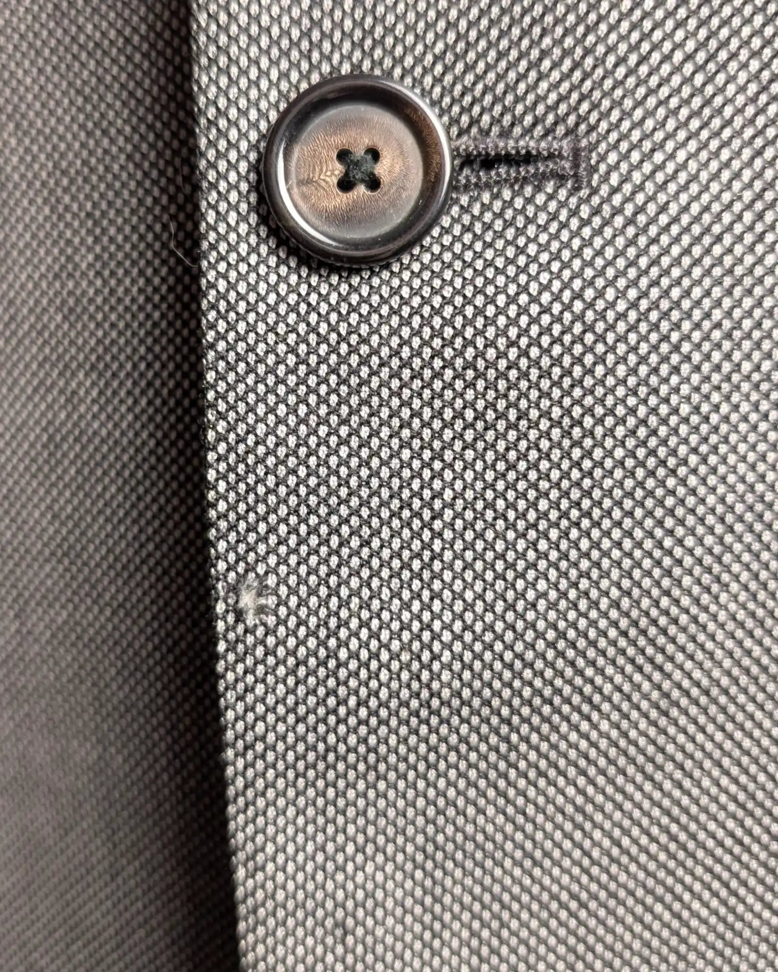 - Kleines Loch im Frontbereich, unterhalb des obersten Knopfs (Das kleine Loch im Oberstoff lässt sich durch einen Schneider oder einen Kunststopfer minimalisieren)